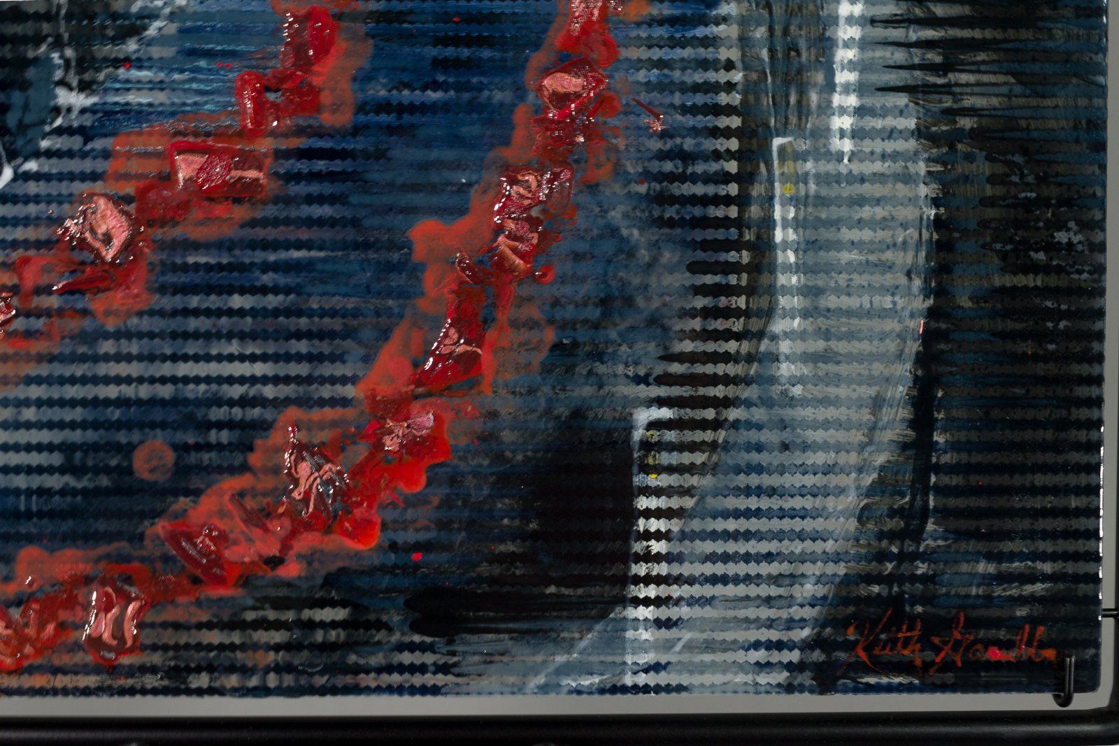 Bright red taillights jittering in a trail around a mountain pass, a staccato record of the many cars that have traveled over this road. This glasswork features heavily textured glass fused on the surface of a flat panel. It has been rendered by a combination of direct painting and silkscreen printing, with raw exposed brushstrokes mingling into a dotted pattern that both carries the image and dissolves it into the dusky landscape. The red dances on the cool night-time tones of gray and blue.